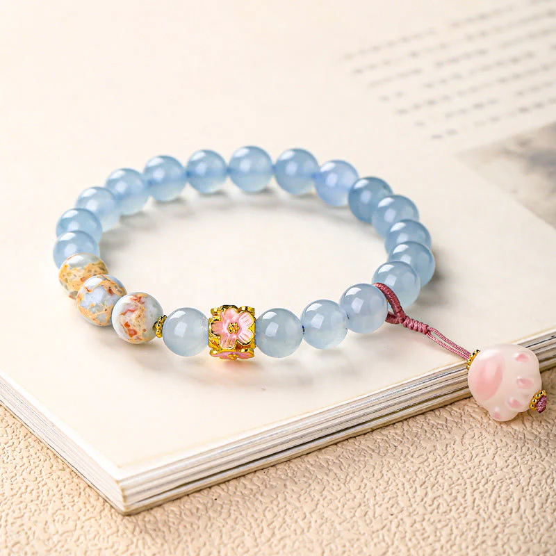 Buddha Stones Blue Chalcedony Fu Character Cat Paw Healing Bracelet