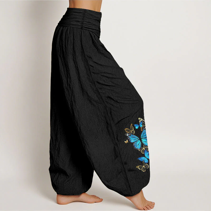 - Design: These harem pants cleverly incorporate a blue butterfly pattern, giving the overall design a vibrant, natural feel. Butterflies symbolize freedom, change, and rebirth, representing continuous transformation and the infinite possibilities of life. The exquisite blue butterfly pattern on the pants, like fluttering sprites, brings a light and dynamic visual effect. The combination of butterflies and gold details presents an elegant yet energetic atmosphere. The overall design not only showcases the beauty and harmony of nature but also conveys a symbol of vitality and a pursuit of freedom, reflecting a positive attitude towards life.